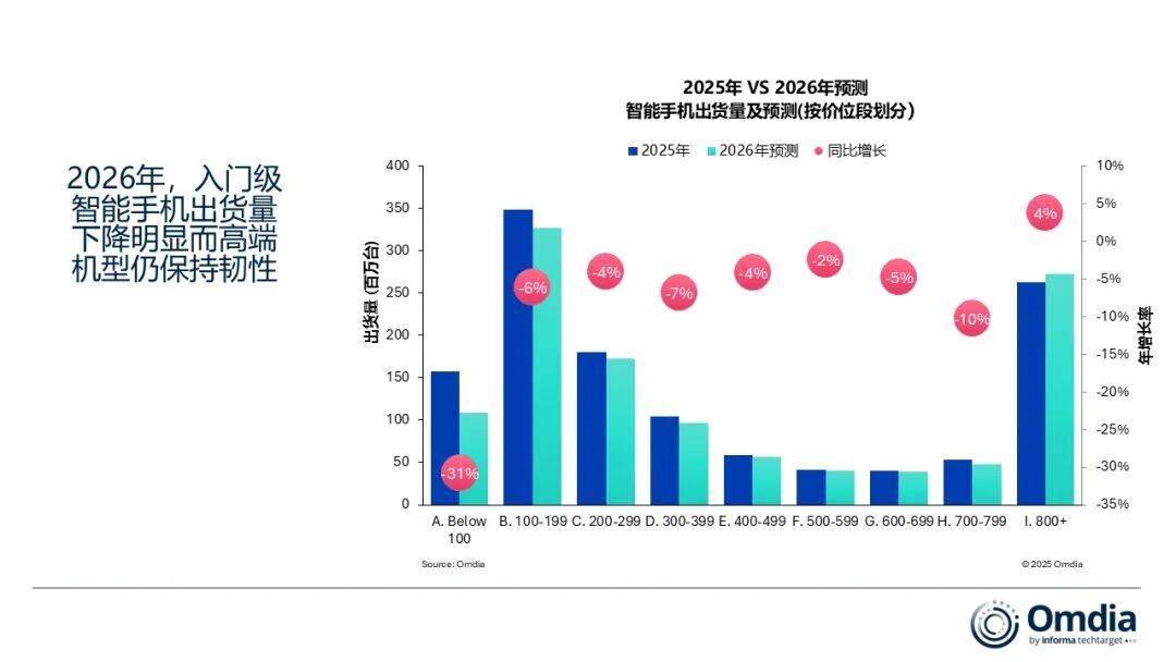 Omdia首席分析师李泽刚(Zaker Li )表示:“不断上升的存储器成本和宏观经济压力预计将对不同价格段的智能手机需求产生不同的影响。2026年,售价低于100美元的智能手机出货量预计将同比下降近31%,反映出超低价位市场面临的严重利润压力。这一价格段对宏观经济环境的轻微变化也极为敏感。” 同时,100–399 美元价格区间作为全球智能手机市场的核心出货段,也预计将出现收缩,因为存储器价格上涨正在推高零售价格,特别是在价格敏感市场。这些市场主要由专注入门级设备的厂商服务,它们高度依赖 LPDDR4X 存储、利润率较低,并且在存储供应链中的优先级通常较低,因此更容易受到成本上涨和潜在供应短缺的影响。结果是,集中在这些价格段的厂商将面临生产限制和出货下降,许多厂商在 2026 年可能出现两位数的出货下滑。”