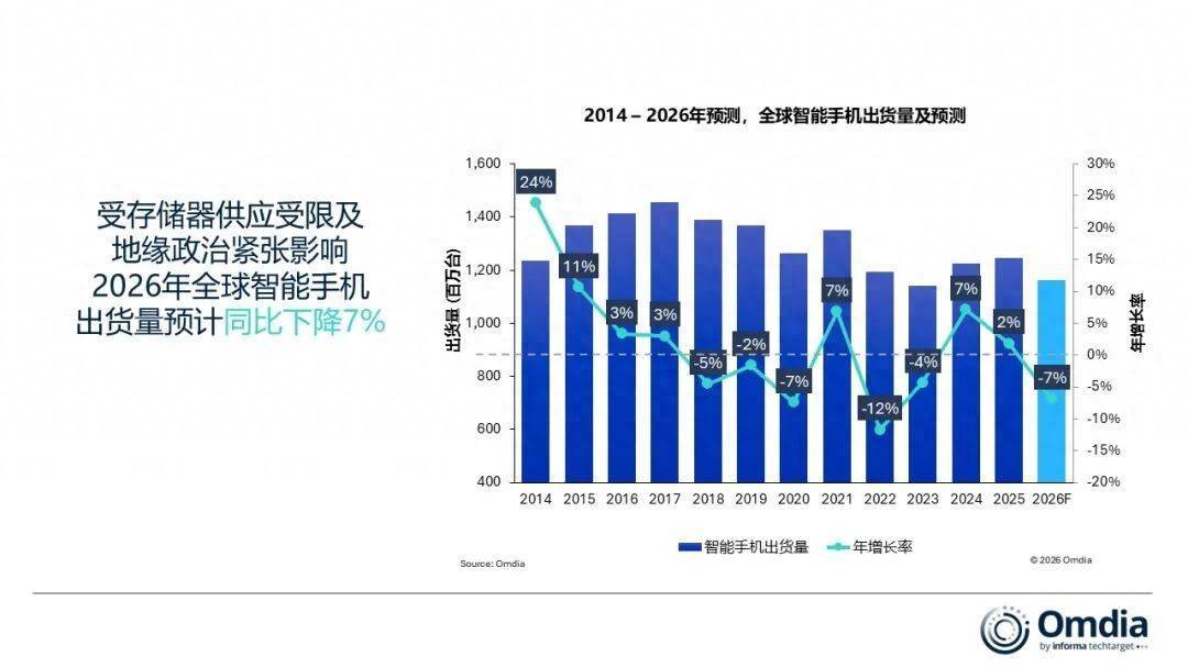 智通财经APP获悉,Omdia最新预测,2026年全球智能手机出货量预计将同比下降约7%。该预测基于2026年第一季度的存储器价格假设,预计随着时间推移,价格压力和供应紧张将在今年下半年开始有所缓解。2026年,全球智能手机市场将面临显著挑战。存储器供应趋紧以及价格持续高位,使厂商成本压力不断上升。目前,存储器在智能手机物料清单(BOM)中的占比明显提高,正侵蚀厂商的盈利能力,尤其是对入门级设备影响更为明显。自2025年第四季度以来,智能手机厂商已开始提高零售价格以维持利润率。然而,持续的价格上涨可能削弱市场需求,尤其是在价格敏感的新兴市场。